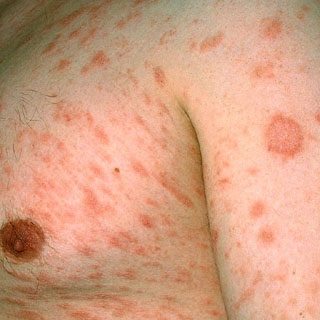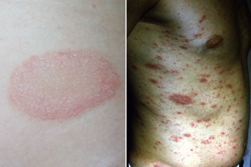 | Appearance | 'Tear drop', scaly papules on the trunk and limbs | Herald patch followed 1-2 weeks later by multiple erythematous, slightly raised oval lesions with a fine scale confined to the outer aspects of the lesions. |