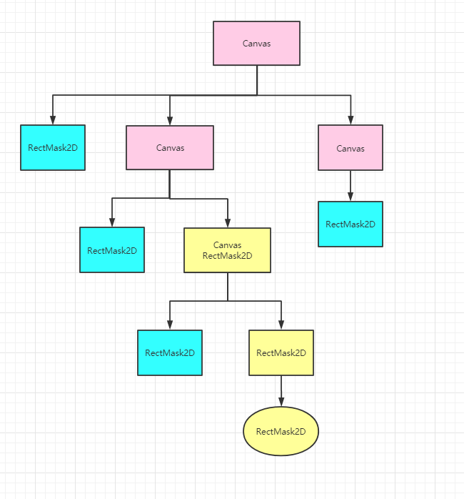 根据m_ShouldRecalculateClipRects获取同一个canvas下,属于同一个父节点下的所有RectMask2D(排除掉canvas的sortingorder被设置的RectMask2D) 如下图,椭圆黄色RectMask2D为当前节点,所有黄色RectMask2D会被加入列表m_Clippers