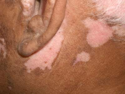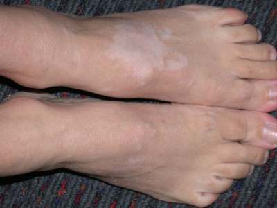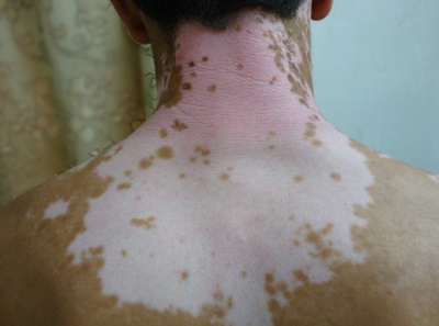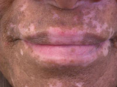 - well-demarcated patches of depigmented skin