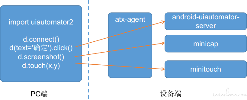 am instrument启动的一个安卓进程,拥有adb shell权限,长连系统的AccessibilityService,并负责自动化操作(基于selector的点击、按钮、输入等);因为是adb shell权限,所以才得以可以操作其他APP(待测APP)设备端大管家是atx-agent,必须有adb shell运行权限,保活其他三个,同时是设备端HTTP服务器入口,负责路由HTTP请求给另外三个部件