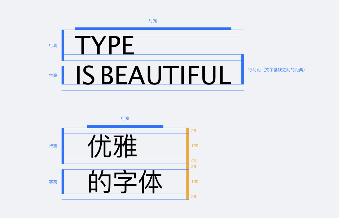 但无论是中文还是西文,我们经常需要用到的无非是字体大小,字重,字色,还有就是经常被我们忽视的行高和行宽,我们从西文字体提取三个最主要的因素,即字高、行高、行宽。基于西文字体的结构转换为中文,我们可以理解为,字高指的就是我们肉眼所能看到的字体的实际高度,而行高指的是字高+上边距和下边距,反过来说,行高减去字高除以 2 就能得到我们的上下边距,行宽指的就是整个文本的宽度。