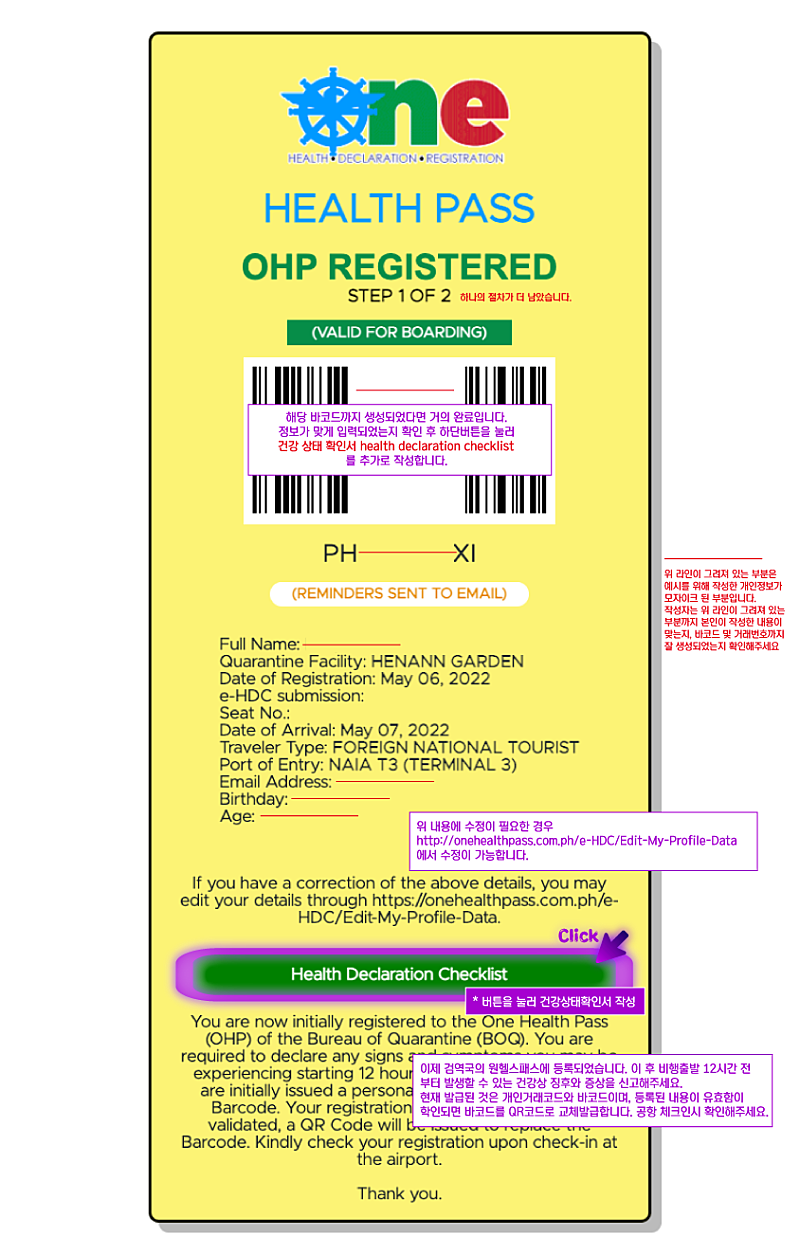 - 코로나 전 필리핀 여행시 비행기에서 수기로 작성하던 검역신고서를 인터넷으로 미리 등록하도록 사이트가 개설되었습니다. 현재 개인 건강에 관한 질의부분은 삭제되어 입국 전 비행기에서 추가 작성될 수 있습니다.