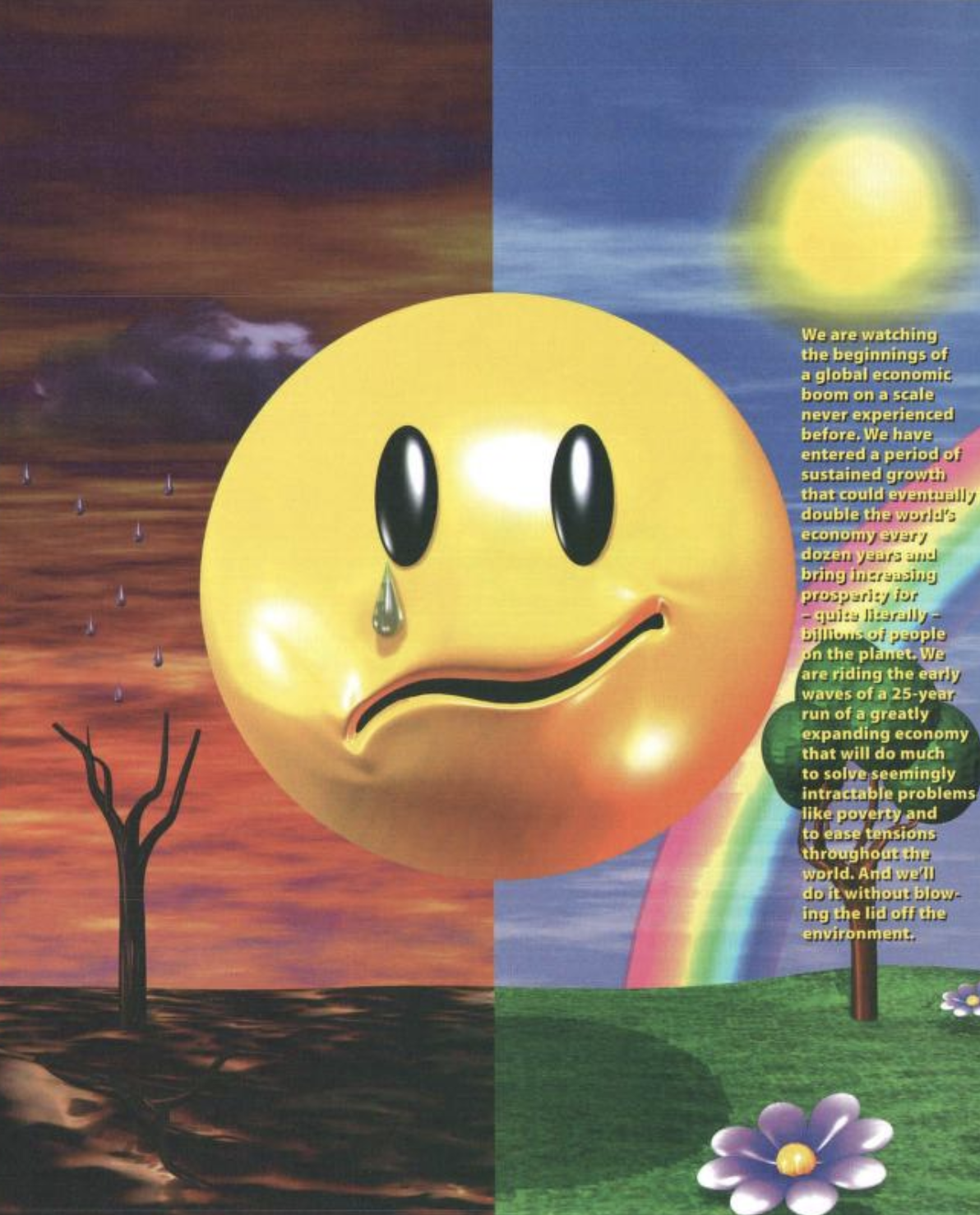 A brightly coloured illustration which can be viewed in any direction. It has several scenes within it: miners digging in front of a huge mountain representing mineral resources, a hand holding a lump of coal or carbon, hands manipulating stock charts and error messages, as well as some women performing tasks on computers.