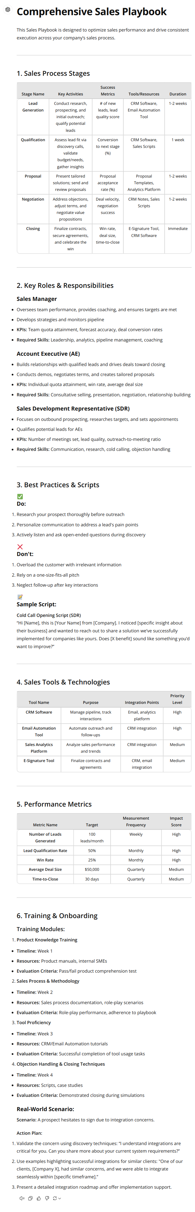 Create a comprehensive Sales Playbook with this ChatGPT mega-prompt to optimize sales performance and drive consistent execution. Benefit from structured guidance on sales process stages, roles, best practices, tools, metrics, and training, ensuring clarity and actionable insights for your sales team.