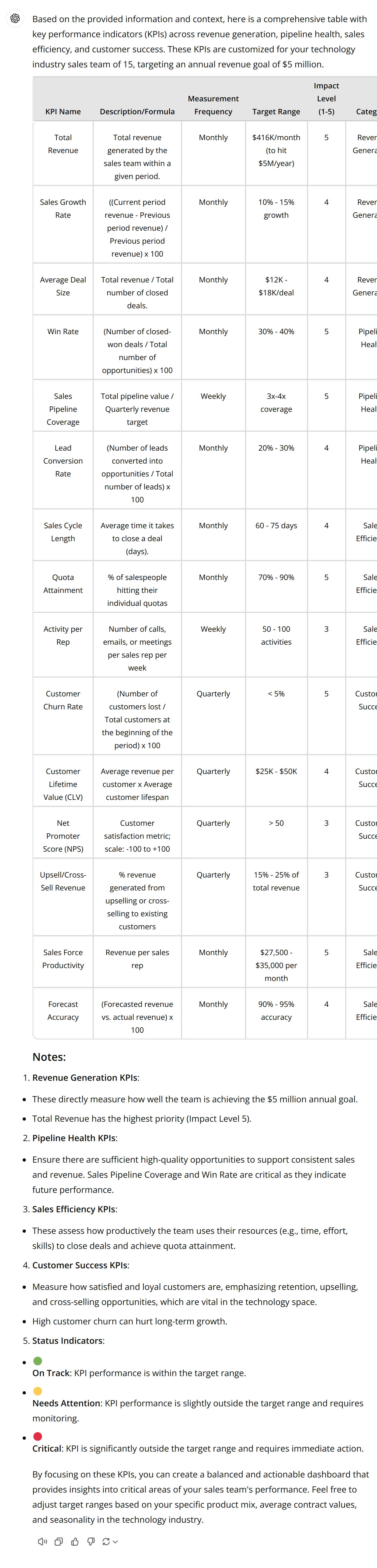 ● Example: If your sales team size is 15, industry is retail, and revenue goal is $500,000, your input would be: "My sales team size: 15, My industry: retail, My company's revenue goal: $500,000."
