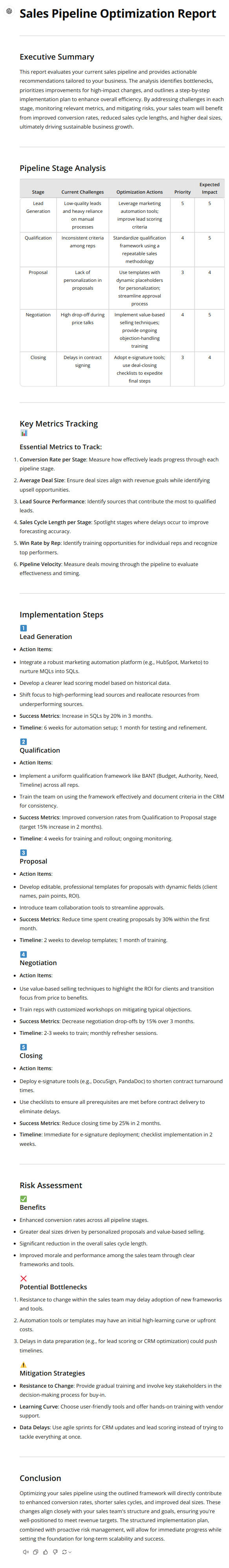 Use this ChatGPT mega-prompt to generate a comprehensive Sales Pipeline Optimization Report tailored to your business needs. Enhance your sales process with actionable recommendations, detailed analysis, and strategic insights for increased conversions and streamlined workflows.
